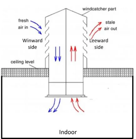 - Вертикални разделителни стени вътре в кулата, които създават няколко канала (секция), за улавяне на вятъра от различни посоки. Този дизайн подобрява ефективността при променливи ветрове.