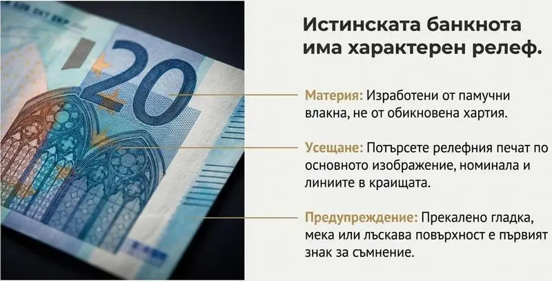 • Специфичен материал: Истинските евробанкноти не са направени от обикновена хартия, а от специални памучни влакна, подобни на тези при българските левове. Това им придава уникална твърдост и усещане за здравина. Ако банкнотата, която държите, е прекалено гладка, мека или лъскава, това е сериозен повод за съмнение.