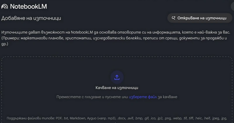 NotebookLM поддържа разнообразни формати на входящи данни, включително PDF файлове, Google документи, презентации, уеб адреси, текстове, аудио и видео материали.